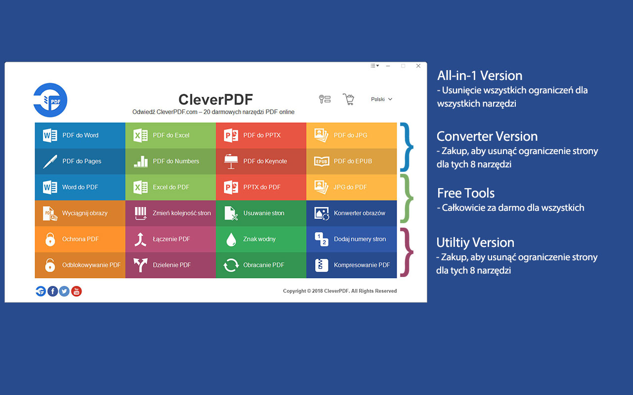 CleverPDF oferuje 24 narzędzi PDF, wszystkie funkcje CleverPDF.com są również dostępne w wersjach desktopowych.Obsługa przetwarzania wsadowego