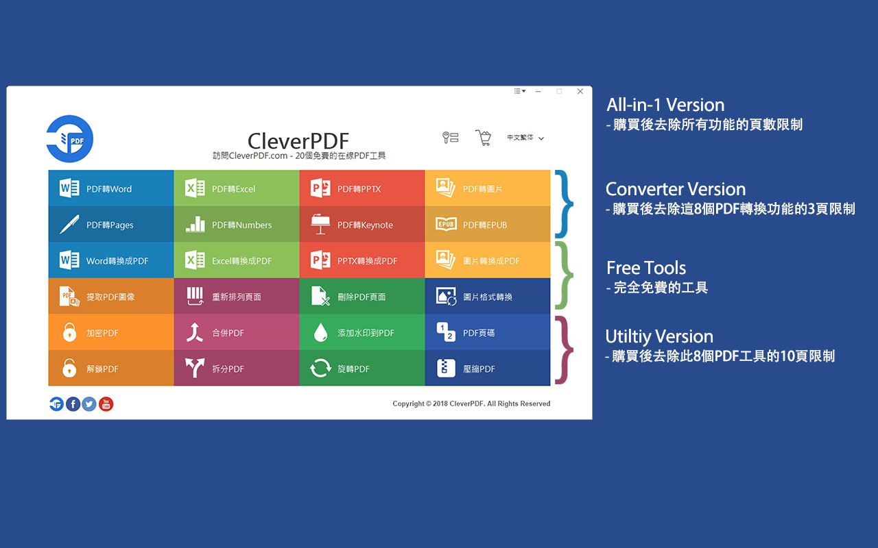 CleverPDF提供一系列免費的PDF工具幫助您完成日常的PDF處理,但如果您擁有桌面端軟體,您的效率將大大提高! 這款20合1的桌面端PDF轉換器十分簡單易用,並且為您不同的PDF轉換需求提供更多更靈活的功能。